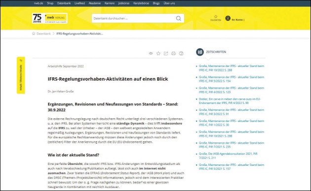 Einen Hinweis auf die neue Version der Arbeitshilfe finden Sie immer im Serviceteil (S. V) der aktuellen Ausgabe sowie im NWB Internationale Rechnungslegung - Livefeed Newsletter, welchen Sie monatlich mit jeder PiR-Ausgabe in Ihrem Email-Postfach finden. Mit einem Klick gelangen Sie von dort aus direkt auf die entsprechende Seite in der NWB Datenbank. Alternativ können Sie die Arbeitshilfe auch einfach aufrufen, indem Sie die DokID NWB XAAAG-79634 in das Suchfenster der NWB Datenbank eingeben.
