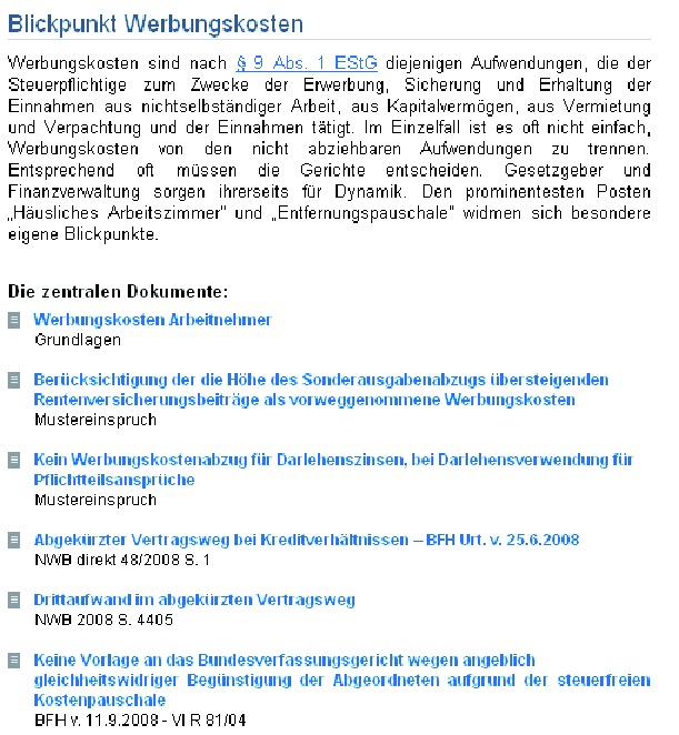 [i]Zentrale Dokumente zu einem ThemaBei wichtigen Themen finden Sie im rechten Bildschirmbereich im „Blickpunkt” Informationen zum gesuchten Begriff (z. B. Werbungskosten). Der Blickpunkt enthält redaktionell zusammengestellt die zentralen Dokumente. So erfahren Sie alles auf einen Blick.