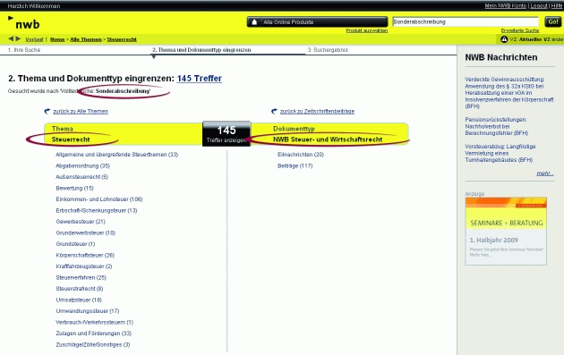 [i]Volltextsuche nach „Sonderabschreibung”Sie suchen Informationen zur Sonderabschreibung nach § 7g EStG und geben unter „Suche nach” das Stichwort „Sonderabschreibung” in das Suchfeld ein. Nachdem Sie die Schaltfläche „Go!” angeklickt haben, zeigt Ihnen die NWB Waage keine unübersichtliche Trefferliste an, sondern hält neue Navigationsoptionen für Ihre Suche bereit.