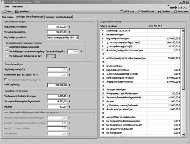 Sie finden in Ihrer NWB Datenbank in der Kategorie „Arbeitshilfen” eine Vielzahl von Checklisten und Übersichten. Berechnungsprogramme bilden einen weiteren Schwerpunkt dieses Bereichs. Mit dem Berechnungsprogramm „Erbschaftsteuer-Rechner” ermitteln Sie die anfallende Erbschaft- und Schenkungsteuer auf schnelle und einfache Art und Weise. Dabei können Sie die Berechnung sowohl für die „neue” Rechtslage als auch für die „alte” Rechtslage durchführen.