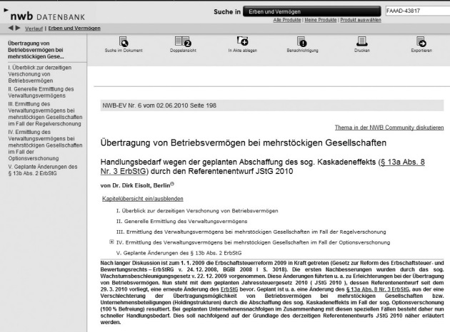 In dem Beitrag „Übertragung von Betriebsvermögen bei mehrstöckigen Gesellschaften – Handlungsbedarf durch den Referentenentwurf des JStG 2010” (NWB-EV 6/2010 S. 198) gibt Eisolt einen Überblick über die geplanten Änderungen im Zusammenhang mit Unternehmensnachfolgen. Diesen Beitrag können Sie unter der DokID NWB FAAAD-43817 aufrufen. In NWB-EV 9/2010 S. 298 beleuchtet Wenhardt die Gleichstellung von Lebenspartnern und Ehegatten im Bereich der Erbschaft- und Schenkungsteuer. Diesen Beitrag können Sie unter der DoK-ID NWB VAAAD-49091 aufrufen.