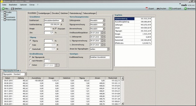 Der [i]Das Berechnungsprogramm können Sie aufrufen unter NWB XAAAD-42022Kredit-Rechner ist ein leistungsstarkes Programm zur Berechnung von Darlehen (Annuitäten-, Tilgungs-, Festdarlehen) und Konsumentenkrediten. Eine Besonderheit liegt dabei in der Möglichkeit, Lebensversicherungen und Investments zu berücksichtigen. Auf diese Weise können Sie ganzheitliche Finanzierungspläne erstellen.