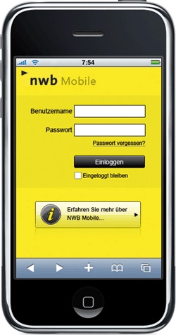 Für Nutzer eines Apple iPhones bietet NWB darüber hinaus einen besonderen Service: Über die kostenfrei im iTunes App Store erhältliche App „NWB Mobile” kann NWB Mobile besonders komfortabel genutzt werden. Die App loggt Sie als Nutzer automatisch ein und merkt sich Ihre Benutzerkennung. Suchen Sie direkt auf Ihrem iPhone im iTunes App Store nach NWB Mobile und laden Sie diese anschließend kostenlos auf Ihr Handy.
