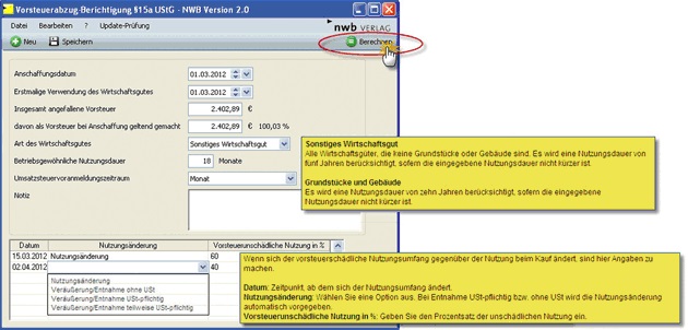 Mit dem Berechnungsprogramm „Vorsteuerabzug-Berichtigung § 15a UStG” aus der NWB Datenbank ermitteln Sie den Betrag, um den die Vorsteuer berichtigt werden muss, wenn
