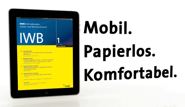 [i]www.nwb.de/go/iPadDie iPad-Ausgaben sind exklusive Zusatzangebote und nur für Abonnenten der jeweiligen Zeitschrift bzw. des entsprechenden Fachmoduls von NWB erhältlich! Besuchen Sie unsere Internetseite www.nwb.de/go/iPad und wählen Sie hier Ihre iPad-Ausgabe aus. Diese können Sie zunächst vier Wochen kostenlos testen.