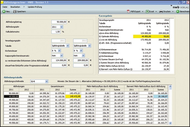 Erhält der Arbeitnehmer vom Arbeitgeber aufgrund der Auflösung des Dienstverhältnisses einen Geldbetrag, wird diese Zahlung als Abfindung bezeichnet. Um dem scheidenden Arbeitnehmer entgegenzukommen, versuchen viele Arbeitgeber die steuerliche Belastung, die sich aus dieser Abfindung ergibt, möglichst gering zu halten. Hierbei kann Sie der Abfindungsrechner NWB TAAAD-52180 der NWB Datenbank unterstützen.