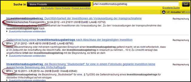 Sie suchen Rechtsprechung zum Thema „Investitionsabzugsbetrag”. Geben Sie einfach die Suchworte „Urteil” und „Investitionsabzugsbetrag” in das Suchfenster ein. Die NWB Datenbank liefert Ihnen nun schwerpunktmäßig Urteile zu Ihrem [i]Urteile zum InvestitionsabzugsbetragThema.