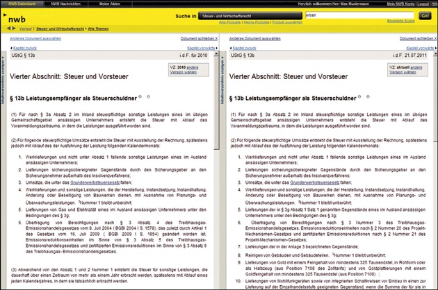 Die Doppel-Ansicht bietet sich immer dann an, wenn Sie in zwei Dokumenten gleichzeitig nachschlagen möchten, z. B. wenn Sie den jeweiligen Gesetzestext zu einem Beitrag aufrufen oder das entsprechende Urteil zu einer Urteilsbesprechung lesen möchten. Ein weiterer wichtiger Anwendungszweck der Doppel-Ansicht liegt in der Möglichkeit, unterschiedliche Fassungen von Gesetzestexten einander gegenüberzustellen. Auf diese Weise erkennen Sie schnell, was sich geändert hat.