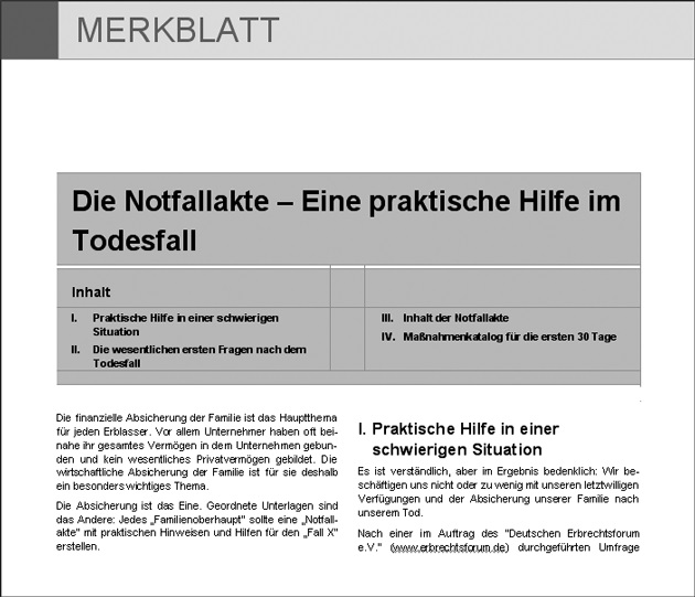 Das Mandanten-Merkblatt „Die Notfallakte – Eine praktische Hilfe im Todesfall” NWB SAAAC-62035 erläutert den notwendigen „Mindest-Inhalt” einer sog. Notfallakte. Dieses „Mindest-Programm” erfordert einen relativ geringen Zeitaufwand, bietet im Notfall jedoch eine große praktische Hilfe.