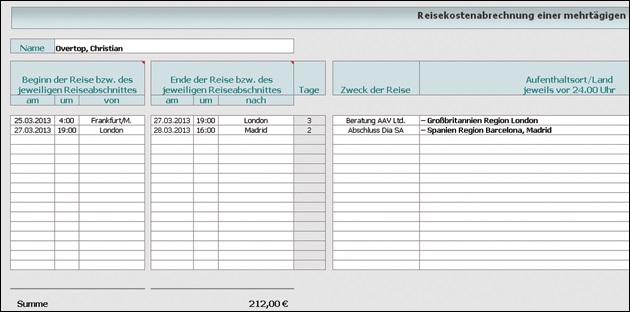 [i]Das Berechnungsprogramm „Reisekosten Ausland” ist unter der NWB DokID NWB JAAAD-55617 aufrufbar Mit dem Berechnungsprogramm „Reisekosten Ausland”NWB JAAAD-55617 ist eine vollständige und steuerlich korrekte Erfassung Ihrer für berufliche Auslandsreisen entstandenen Kosten möglich. Zur Verfügung stehen Tools für die Dokumentation mehrerer Aufenthaltsorte (z. B. bei Flugreisen) und mehrtägiger Dienstreisen, ein Assistent für die automatisierte Erfassung der Reisekosten sowie Formulare zur manuellen Erfassung der Reisekosten nach dem aktuellen Recht und für Reisen ab 2014.