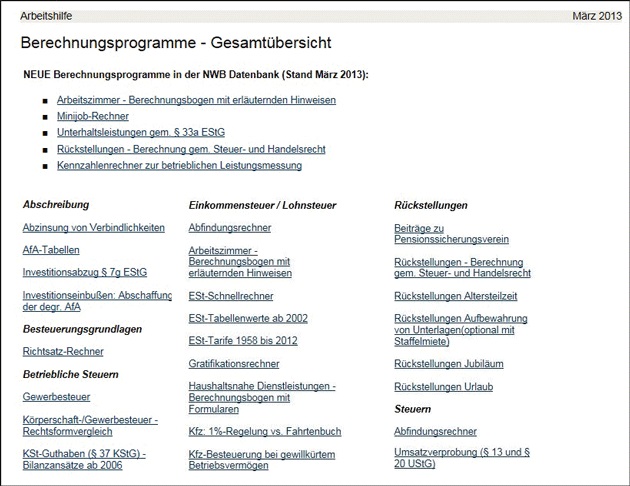 [i] Gesamtübersicht Berechnungsprogramme NWB QAAAB-43546Die Berechnungsprogramme befinden sich unter dem Dokumenttyp „Arbeitshilfen” auf der Startseite Ihrer NWB Datenbank. Klicken Sie nun auf „Berechnungsprogramme” und Sie gelangen zu einer Liste mit allen Berechnungsprogrammen in alphabetischer Reihenfolge. Unter der NWB DokID NWB QAAAB-43546 können Sie direkt eine Gesamtübersicht aller in Ihrer NWB Datenbank vorhandenen Berechnungsprogramme aufrufen.
