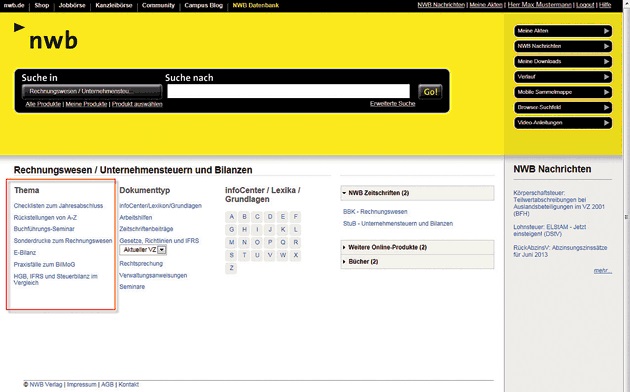 NWB [i]www.nwb.deRechnungswesen heißt das kostenlose Datenbank-Modul zu Ihrer BBK. Auf der Startseite dieses Moduls finden Sie viele Rechnungsweseninhalte auf einen Blick. Nachfolgend stellen wir Ihnen die Besonderheiten Ihres Fachmoduls vor.