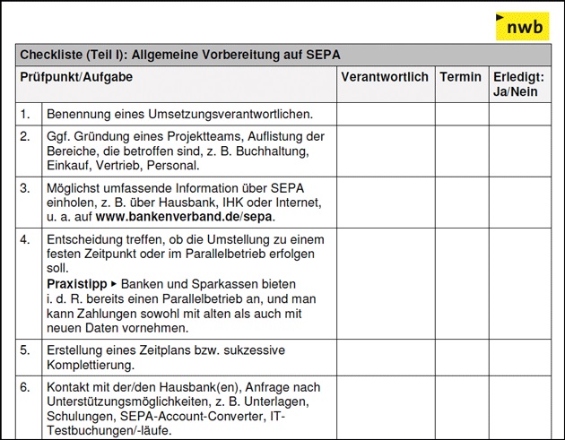 NWB Betriebswirtschaftliche Beratung stellt Ihnen eine Checkliste zur Vorbereitung und Umstellung auf SEPA zur Verfügung. Sie hilft Ihren Mandanten bei der Umstellung auf das neue Zahlungssystem und gibt vor allem Orientierung. Sie ist zweigeteilt in