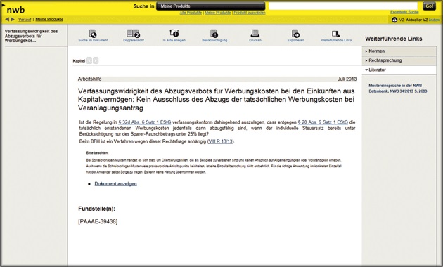 Um einen passenden Mustereinspruch zu finden, geben Sie einen oder mehrere aussagekräftige Schlagworte in das Suchfeld auf der Startseite Ihrer NWB Datenbank ein. In der Kategorie „Arbeithilfen“ finden Sie jetzt die passenden Mustereinsprüche zu Ihrer Anfrage. Aus über 1.000 aktuellen Mustereinsprüchen finden Sie zu fast allen beim BFH, EuGH und BVerfG laufenden Steuerverfahren auf den konkreten Fall zugeschnittene, rechtssicher formulierte und sofort einsetzbare Mustereinsprüche im Word-Format. Einfach Mandantendaten ergänzen – fertig.