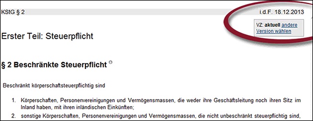 [i]Normen mit dem Rechtsstand zurückliegender VZDer Stand bzw. die Fassung der Vorschrift wird stets oben rechts im grauen Balken angezeigt. Viele steuerliche Gesetze finden Sie in der NWB Datenbank auch mit früherem Rechtsstand – die zurückliegenden Veranlagungszeiträume reichen zurück bis 1996. Sie können den VZ auch bei der gerade aufgerufenen Norm oben rechts durch einen „Klick“ auf „VZ: aktuell andere Version wählen“ wechseln.