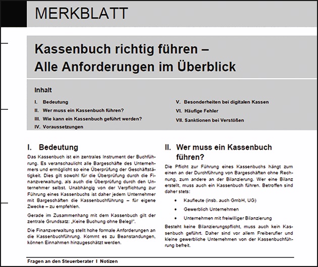 [i]26 MerkblätterDie 26 Merkblätter geben Ihnen grundlegende Informationen an die Hand zu Themen wie Kassenführung oder Reisekosten.