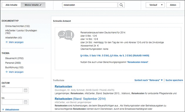 Wenn Sie sich einen Überblick über ein Schlagwort verschaffen möchten, können Sie die Suche ohne Filter starten. Bei der Suchphrase „Reisekosten Ausland“ bekommen Sie selbst bei der Beschränkung auf den Zeitraum seit Anfang 2014 eine Liste von mehren Dutzend Dokumenten – darunter Aufsätze, Arbeitshilfen, Verwaltungsanweisungen.
