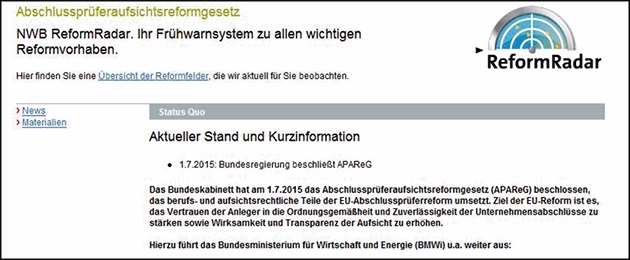 Erkennen. Verstehen. Reagieren. Der NWB ReformRadar zeigt, was auf Sie zukommt! Und hilft Ihnen mit aktuellen Nachrichten, Tipps, Tools und Informationen dabei, Ihre Position zu allen relevanten Reformprojekten und Gesetzesinitiativen zu bestimmen, damit Sie im Interesse Ihrer Mandanten rechtzeitig souverän reagieren können! Sie finden den NWB ReformRadar direkt auf unserer Startseite www.nwb.de. Neben der Neuregelung der Erbschaftsteuer, dem Zollkodexanpassungsgesetz 2.0 („Jahressteuergesetz 2016“), der Anhebung von Grundfreibetrag und Kindergeld u. a., dem Bürokratieentlastungsgesetz und dem BilRUG, finden Sie auch alle Informationen zur Umsetzung der EU-Reform der Abschlussprüfung.