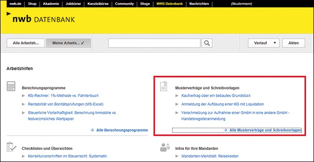 [i]Gesamtübersicht über alle Arbeitshilfen in der NWB DatenbankZu einer Übersicht aller NWB Arbeitshilfen kommen Sie durch einen Klick auf das Arbeitshilfen-Icon auf der Startseite Ihrer NWB Datenbank. Über den Link „Alle Musterverträge und Schreibvorlagen“ gelangen Sie zu einer Gesamtübersicht.