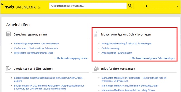 [i]Ca. 400 Musterverträge und SchreibvorlagenIn Ihrer NWB Datenbank finden Sie in der Kategorie „Arbeitshilfen“ eine Vielzahl von praxisnahen Hilfen für Ihren Arbeitsalltag. Checklisten und Übersichten (s. ) sind wichtige Bausteine. Einen weiteren Schwerpunkt bilden die knapp 400 Musterverträge und Schreibvorlagen. Einige interessante Schreibvorlagen und Musterverträge möchten wir Ihnen an dieser Stelle vorstellen.