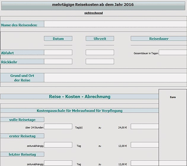 Dieses Excel-Tool unterstützt bei der vollständigen und steuerlich korrekten Erfassung der jeweils angefallenen Reisekosten in 2016 für Dienstreisen im Inland. Beim Berechnungsprogramm „Reisekosten-Abrechnung Inland – 2016“ NWB AAAAF-19222 können Sie zwischen folgenden Eingabeformen wählen: