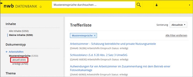 [i]Schnell und einfach passende Mustereinsprüche findenUm einen passenden Mustereinspruch zu finden, geben Sie ein oder mehrere aussagekräftige Schlagworte in das Suchfeld auf der Startseite Ihrer NWB Datenbank ein. In der Kategorie „Arbeitshilfen“ finden Sie jetzt die passenden Mustereinsprüche zu Ihrer Anfrage.