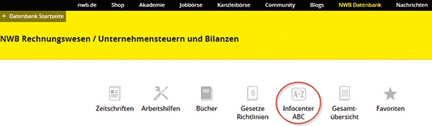 [i]NWB Datenbank: www.nwb.deZum Lösen komplexer Fragestellungen in Ihrem Berufsalltag ist es wichtig, schnell punktgenaue Antworten zu finden. Im infoCenter finden Sie zu diversen Themen einen kompakten Überblick. Die Grundlagenbeiträge in der NWB Datenbank beleuchten hingegen die Themen in aller Tiefe.