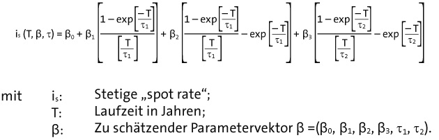 Im Rahmen von Unternehmensbewertungen nach IDW S 1 i. d. F. 2008 und bei Beteiligungsbewertungen nach IDW RS HFA 10 wird auf der Grundlage des sog. Capital Asset Pricing Model (CAPM) ein Kapitalisierungsfaktor ermittelt, der u. a. einen risikolosen Zinssatz (Basiszins) enthält. Nach IDW S 1 i. d. F. 2008, Tz. 117, empfiehlt es sich, den Basiszinssatz ausgehend von aktuellen Zinsstrukturkurven und zeitlich darüber hinausgehenden Prognosen abzuleiten. Zur Ermittlung des Basiszinssatzes stellt das IDW ein Verfahren vor, das sich auf eine von der Deutschen Bundesbank angewendete Methode stützt und nach der sog. Svensson-Methode Zinsstrukturkurven für Zero-Bondrenditen errechnet. Der Zinssatz wird als Funktion von sechs Parametern definiert, die börsentäglich von der Deutschen Bundesbank veröffentlicht werden.