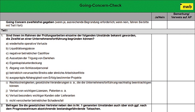 Scheint die Fortführung der Unternehmenstätigkeit gefährdet, muss der Unternehmer bzw. die Unternehmensführung (die gesetzlichen Vertreter) eine Fortbestehensprognose aufstellen. Auch der Wirtschaftsprüfer/Abschlussprüfer hat sich im Rahmen der Durchführung der gesetzlichen Jahresabschlussprüfung vom Grundsatz der Fortführung der Unternehmenstätigkeit zu überzeugen. Mithilfe des Going-Concern-Checks können Sie beurteilen, ob der für die Rechnungslegung zentrale Grundsatz der Annahme der Unternehmensfortführung („Going-Concern“-Prämisse) zu Recht unterstellt werden darf. Die Checkliste wurde kürzlich in der NWB Datenbank aktualisiert und um Praxishinweise ergänzt.
