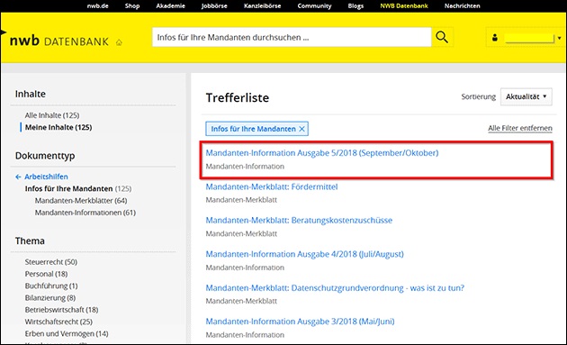 [i]Die Mandanten- Information 5/2018 ist unter der NWB DokID NWB KAAAG-90656 aufrufbar Sie können die Mandanten-Informationen in der NWB Datenbank über einen Klick auf „Arbeitshilfen“ auf der Startseite und dann weiter unter „Infos für Ihre Mandanten“ aufrufen. Dort haben Sie übrigens auch Zugriff auf die Mandanten-Merkblätter zu aktuellen Themen wie Fördermittel oder Beratungskostenzuschüsse.