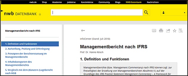 Die NWB Datenbank versorgt Sie mit allen Informationen, die Sie für Ihre tägliche Arbeit brauchen. So finden Sie unter der DokID NWB PAAAG-90060 den neuen Beitrag Managementbericht nach IFRS von Prof. Dr. Hanno Kirsch.