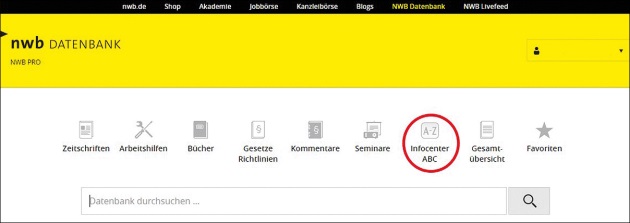 Sie können die Grundlagenbeiträge direkt auf der Startseite der NWB Datenbank aufrufen. Klicken Sie hierzu auf das Icon „Infocenter ABC“: