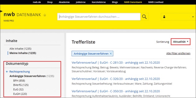 [i]Tipps zur geschickten Recherche unter NWB FAAAF-77459 Steuerlich relevante Verfahren, die beim EuGH anhängig sind, können Sie über die Eingabe des Gerichtsaktenzeichens in die Suchmaske oder die Filterfunktion im linken Bereich der NWB Datenbank ausfindig machen. Hierzu können Sie sich unter dem Dokumenttyp „Rechtsprechung“ die anhängigen Steuerverfahren anzeigen lassen und diese auf Verfahren beim EuGH beschränken. Wenn Sie die Sortierung nach „Aktualität“ einstellen, erhalten Sie eine chronologische Liste der aktuell anhängigen Verfahren mit Gerichtsaktenzeichen, Anhängigkeitsdatum und Thema des Verfahrens.