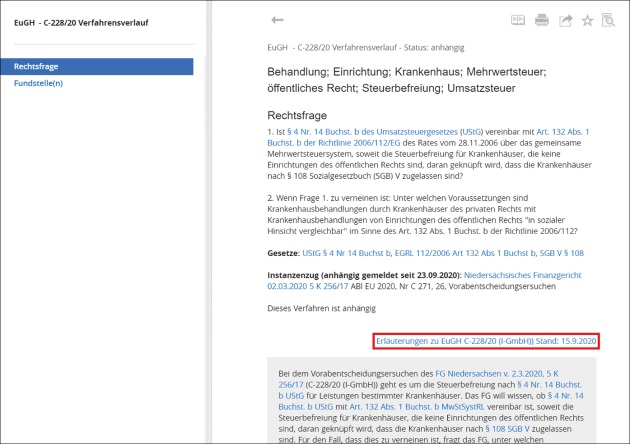[i]Hilfreiche HintergrundinformationenBeim Aufruf eines anhängigen EuGH-Verfahrens haben Sie einen Überblick über das Verfahrensthema, die Rechtsfragen, die betroffenen Gesetze, den Instanzenzug sowie das Meldungsdatum der Anhängigkeit. Beim Klick auf die blau hinterlegten Erläuterungen zum jeweiligen Verfahren öffnen sich weitere interessante und hilfreiche Hintergrundinformationen zum Verfahrensverlauf, Sachverhalt und zur Entscheidungserheblichkeit der Vorlagefragen. Diese werden laufend aktuell eingepflegt und sind somit zeitnah nach Meldung der Anhängigkeit für Sie verfügbar. Damit Sie erkennen, wie aktuell die hinterlegten Informationen sind, [i]Weitere Tipps zur Favoritenverwaltung unter NWB JAAAF-77475 abrufbar ist der Stand der Erläuterung ebenso sichtbar. Wenn Sie sich das Verfahren über das Stern-Symbol als Favorit abspeichern, haben Sie die Möglichkeit, sich mithilfe des Glocken-Symbols über alle Aktualisierungen des Dokuments per E-Mail benachrichtigen zu lassen.S. 3453
