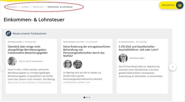 Auf der Livefeed-Startseite werden Ihnen die wichtigsten aktuellen Beiträge und Nachrichten Ihres Kanzlei- oder Themenpakets angezeigt. Zusätzlich können Sie über die Themennavigation Ihr individuelles Themeninteresse fokussieren. Auf den einzelnen Livefeed-Themenseiten werden Ihnen in Abweichung zur Startseite nur die themenspezifischen Beiträge und Nachrichten des jeweils ausgewählten Themas angezeigt. So können Sie bspw. Gesetzgebungsthemen, Themen aus der Finanzverwaltung oder der Rechtsprechung getrennt voneinander betrachten. Gleiches gilt bspw. für Themen aus dem Steuerrecht (bspw. zur Einkommen-/Lohnsteuer) oder dem Rechnungswesen.
