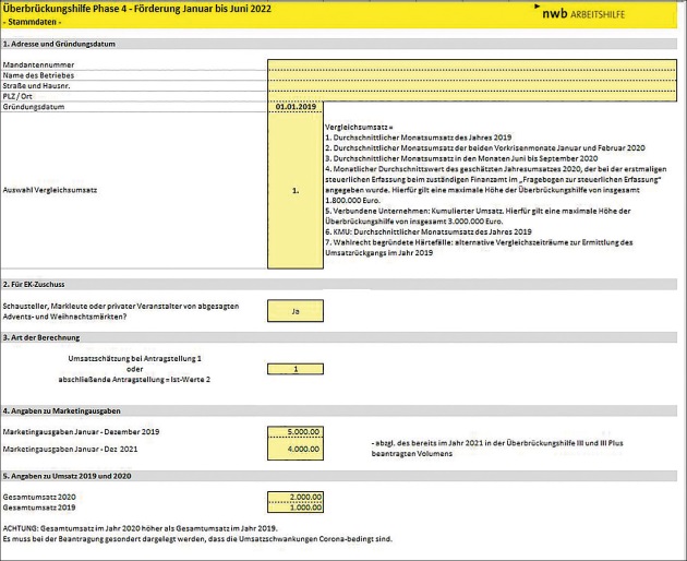 Die Überbrückungshilfe IV hat eine Laufzeit von Januar bis Juni 2022. Für die Ermittlung der Förderungshöhe sind unterschiedliche Voraussetzungen und Maßgaben zu beachten, die in der Excel-Datei berücksichtigt sind.